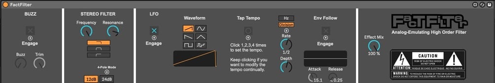 FactFilter is an analogue-emulating 2-pole/4-pole stereo filter inspired by the Electrix Filter Factory, designed from the ground up to emulate the original hardware, featuring a stereo filter, Buzz (overdrive), LFO, and Envelope Follower.